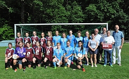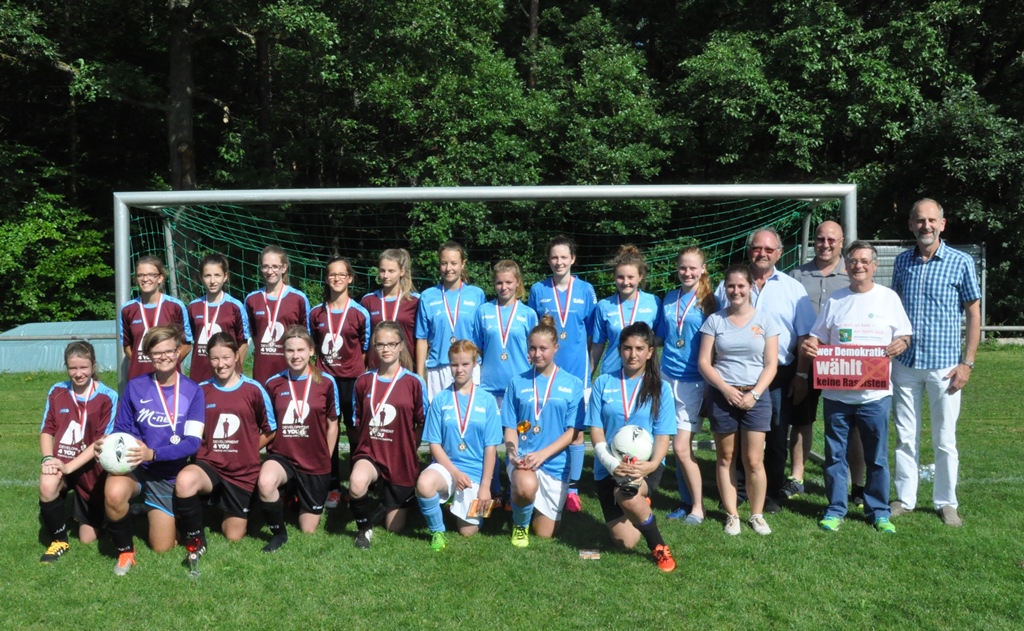 Auf dem Bild zu sehen sind: Spielerinnen sowie Trainer/-innen der U17 Juniorinnen des SV Hetzles und der SpVgg Reuth, Kreisjugendpflegerin Stefanie Schmitt, stellv. Landrat Otto Siebenhaar, Vorsitzender des KJR Forchheim Carl Shell, Ludwig K. Haas vom Gräfenberger Sportbündnis und Martin Mehl (2. Bürgermeister Neunkirchen am Brand)