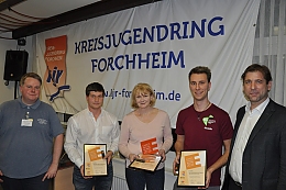 Den 3. Platz belegte Alexander Dittrich vom BDKJ Forchheim gefolgt von Mona Kemmerth von der Wasserwacht Ebermannstadt, die den 2. Platz belegte. Stellvertretend für Mona Kemmerth, die an diesem Abend leider verhindert war, nahm Philipp Nützel den Preis entgegen. Den 1. Platz belegte die langjährige Kreisjugendvorsitzende der Bayerischen Sportjugend Bärbl Flessa. Sie erhielt als Erste den neu entworfenen Pokal.