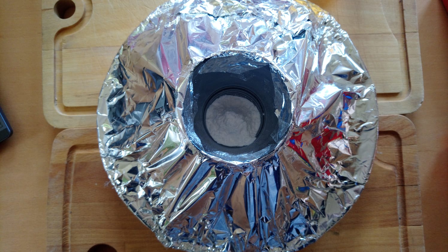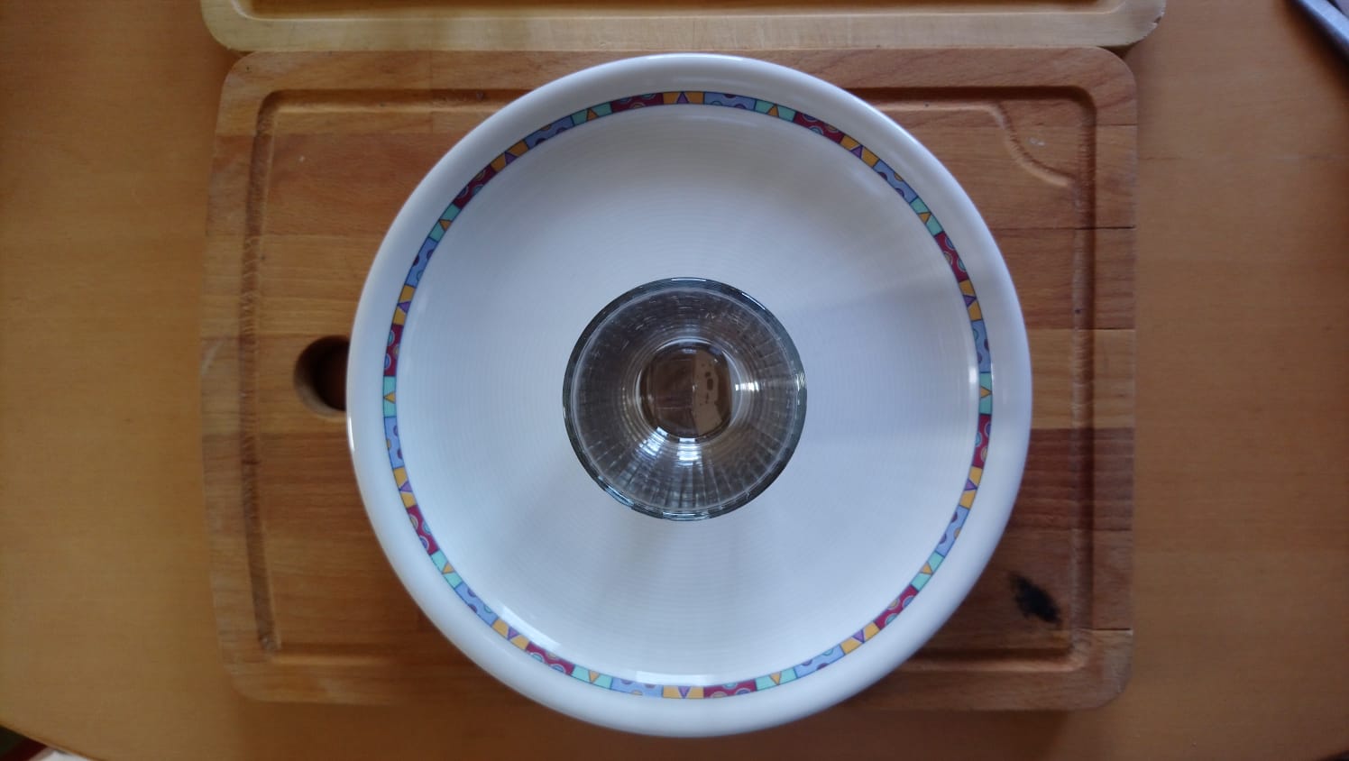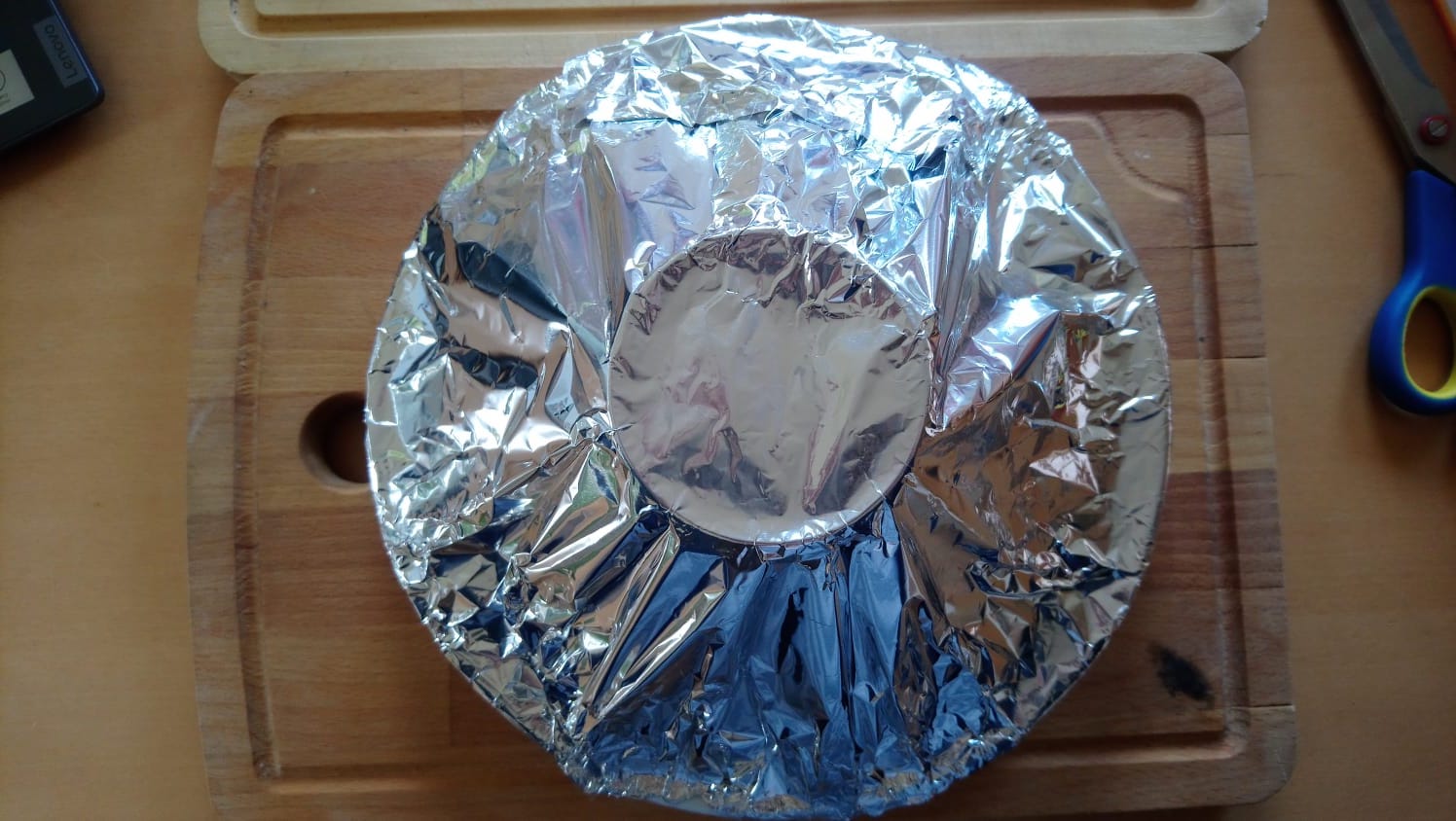 Wickelt zweimal mit Alufolie über Teller und Glas, sodass beides bedeckt ist. Die Folie klebt ihr unter dem Teller fest, so dass nichts verrutscht.