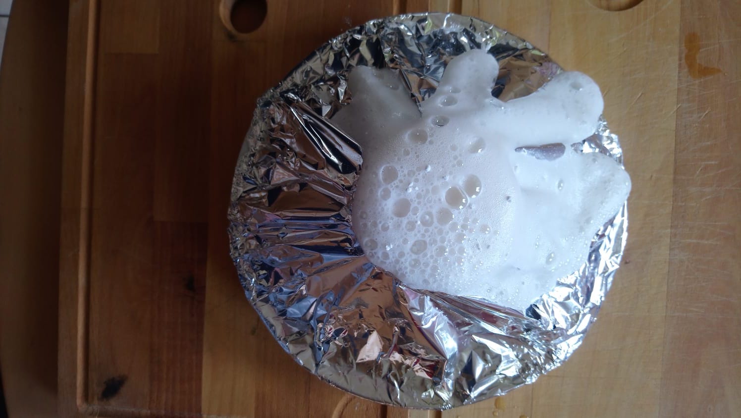 Jetzt schneidet ihr in die Kuppel ein Loch. Von dort aus schneidet ihr bis zum Glasrand ein Kreuz, biegt die Ecken nach innen und klebt sie dort fest. Jetzt habt ihr ein rundes Loch an der Kuppel eures Vulkans. Das Backpulver gebt ihr jetzt in den Krater eures Vulkans.