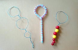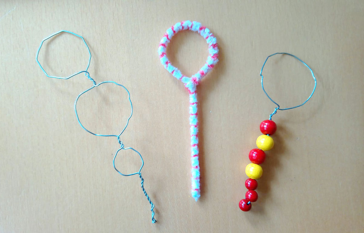 Hier könnt ihr aus Draht Seifenblasenstäbe biegen. Die klassisch Runden oder auch lustig Gebogene in Blumenform, Herzform oder mit mehreren Kreisen hintereinander.