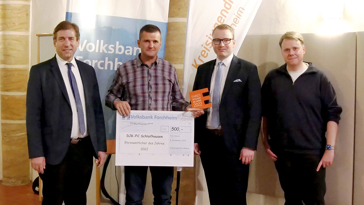 Bild von links: Schirmherr Landrat Dr. Hermann Ulm, Ehrenamtlicher des Jahres Stefan Pieger, Filialleiter der Volksbank Forchheim Felix Fietzeck, amt. KJR-Vorsitzender Thomas Wilfling