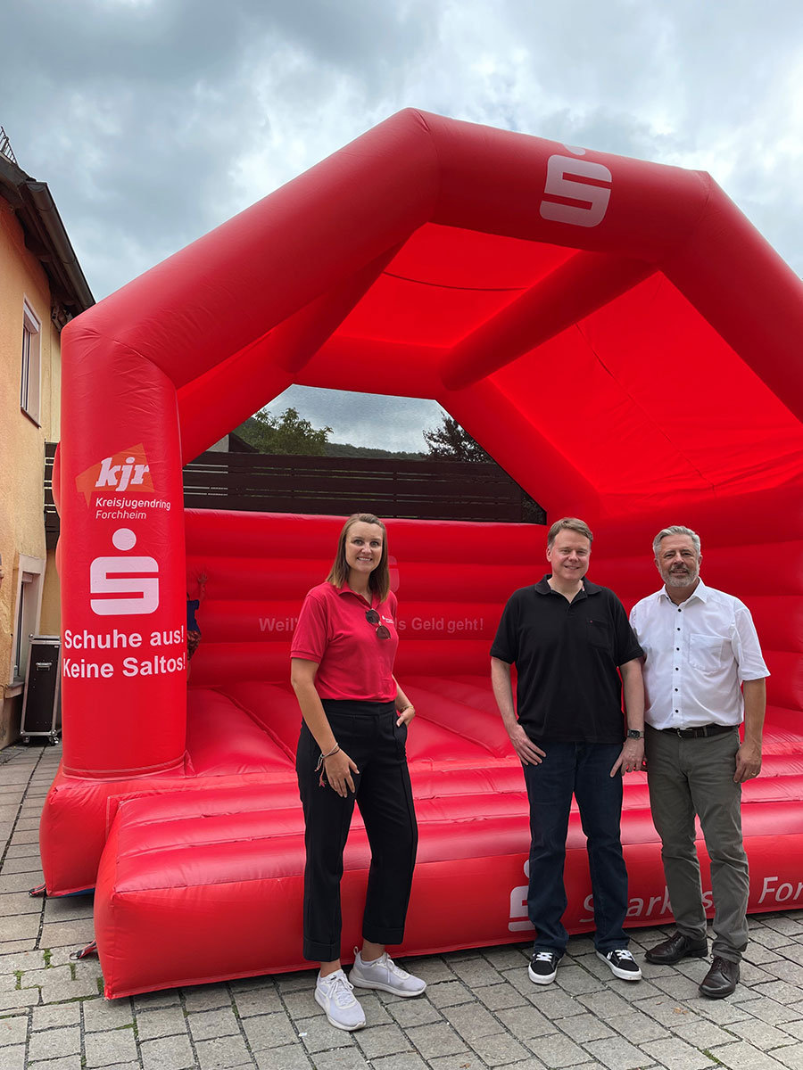 Im Rahmen einer offiziellen Übergabe während des Ebermannstädter Altstadtfestes überreichten Harald Reinsch, Vorstandsmitglied der Sparkasse Forchheim und Charlotte Kaufmann die Hüpfburg im Wert von 3.600,00 € an den amtierenden KJR Vorsitzenden Thomas Wilfling. „Die neue große KJR-Hüpfburg aus der Zukunftsstiftung der Sparkasse Forchheim zu fördern war für uns Herzenssache“, so Charlotte Kaufmann, Pressesprecherin der Sparkasse Forchheim, „eine Hüpfburg bringt auf jedem Fest Kinderaugen zum Strahlen und lädt zum Bewegen ein. Auch wir nutzen die KJR-Hüpfburgen regelmäßig gerne für Veranstaltungen im Landkreis so wie heute beim Altstadtfest in Ebermannstadt.“ Während des Festes kam sie dann auch gleich zum Einsatz. Zahlreiche Kinder erfreuten sich an der Hüpfburg und testeten sie ausgiebig.